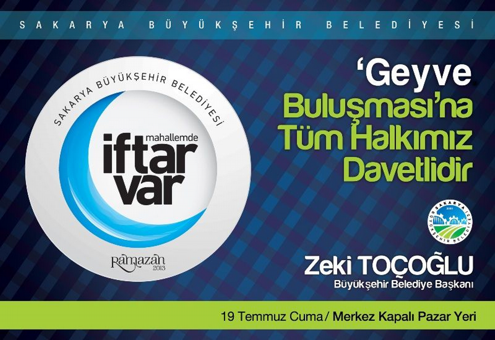 Büyükşehir Belediye Başkanı Zeki Toçoğlu, bu yıl Geyve’ de de iftar programının 19 Temmuz 2013 Cuma günü gerçekleştireceklerini belirtti. Toçoğlu, geçen yıl olduğu gibi bu yıl da Ramazan ayı boyunca şehrin 17 farklı noktasında iftar programları düzenleyeceklerini söyledi. Ramazan ayının bereketini hep birlikte yaşadıklarını ifade eden Toçoğlu, "İftar sofralarında vatandaşlarımızla aynı sofralarda buluşuyor ve onlarla direkt temas içinde olarak sorunlarını birebir dinleme fırsatı elde ediyoruz. Ayrıca kurduğumuz gönül sofralarıyla birlikte ilçelerimizdeki vatandaşlarımızın birbirleri ile ilişkileri artıyor. Biz hemşerilerimizle her zaman iç içe olduk. Ramazan ayında da beraberiz" şeklinde konuştu.