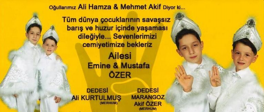 Merhum Ali Kurtulmuş ve merhum marangoz Akif Özer’in torunları, Emine-Mustafa Özer’in oğulları Ali Hamza ile Mehmet Akif: “Tüm dünya çocuklarının savaşsız barış ve huzur içinde yaşaması dileğiyle…”ailesi, akrabaları ve sevenlerinin katılımıyla, hanelerinin önünde AKKAYALAR LOKANTASI tarafından pişirilen yemek ikramından sonra, sünnet olarak erkekliğe ilk adımlarını attı.