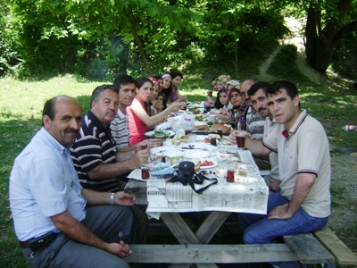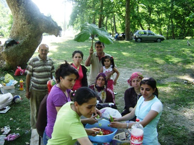Piknikte bayan bayan öğretmenler salata yaparken erkekler de mangal yaptılar, semaverde çay demlediler.