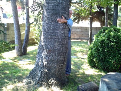 Cemil İZMİRLİ 1962 yılının sonlarında dikmiş olduğu "Lübnan Sediri"ni 1,5 metre yukarıdan kucaklıyor.