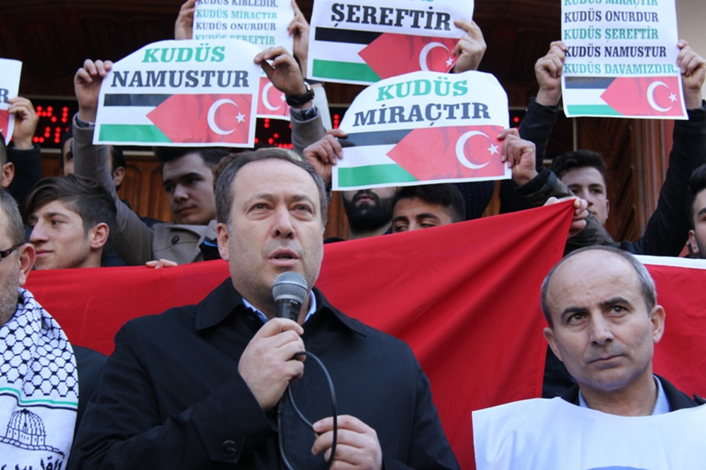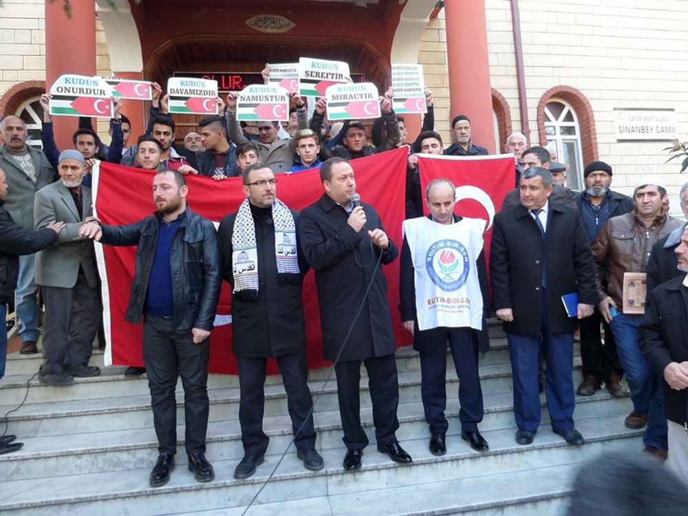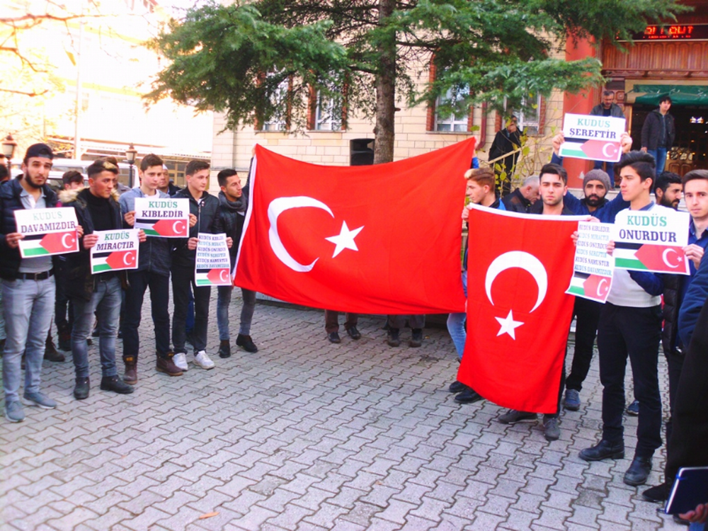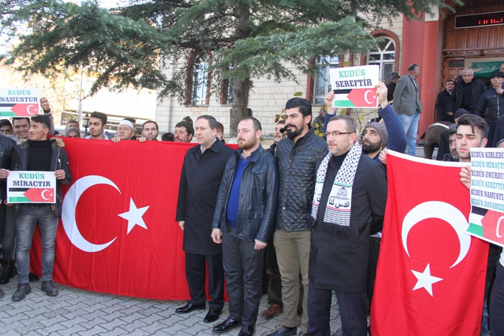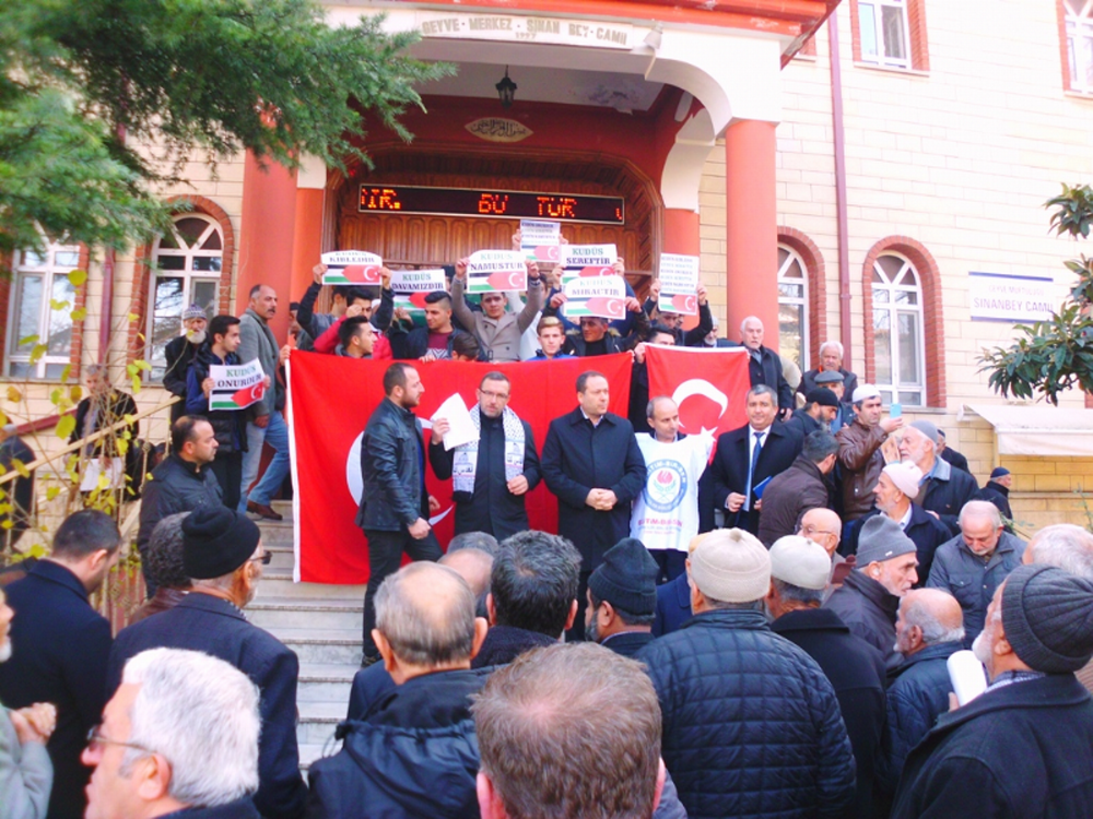 Geyve’de  Sivil Toplum Kuruluşları ve AK Parti İlçe Teşkilatının çağrısıyla  Cuma namazı sonrası Merkez Camii önünde toplanan müslümanlar, Kudüs’ün İsrail’in başkenti ilan edilmesine tepki gösterdi.