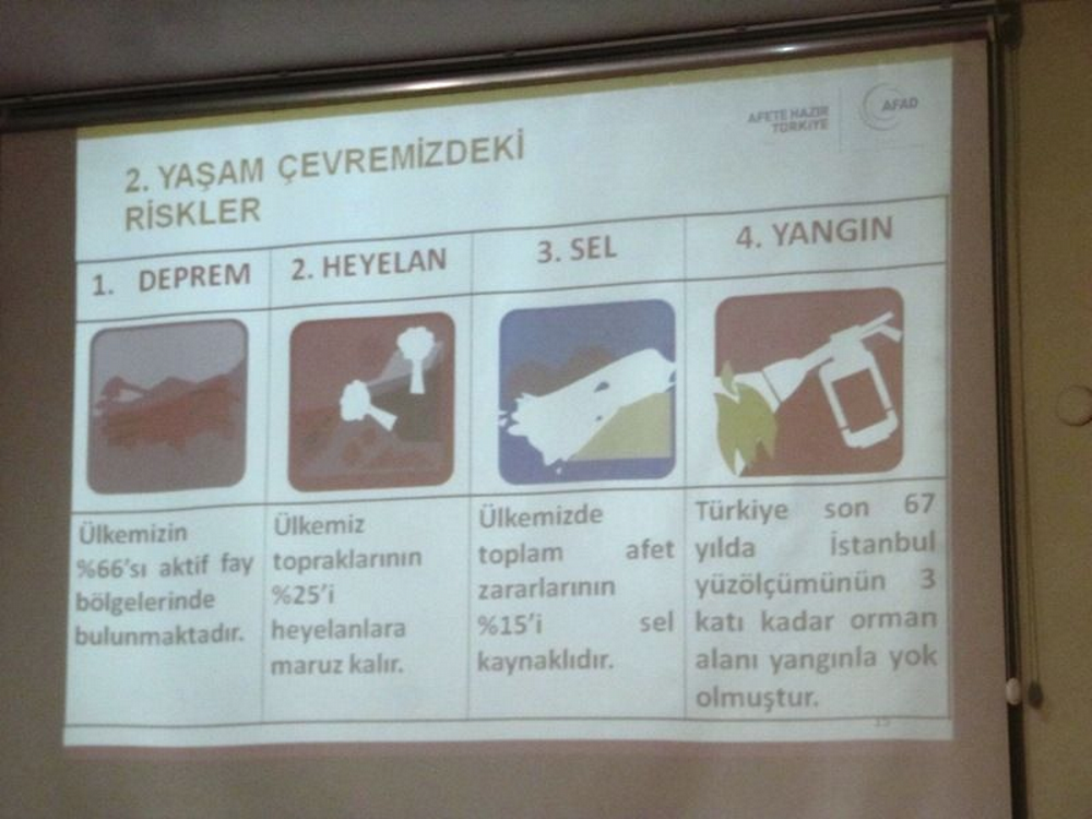Geyve Kaymakamlığı kültür Merkezi ve Öğretmenevi salonda düzenlenen seminerde; MEM şube müdürü Mehmet Doğan, doğal afetlerden nasıl korunulacağını anlattı.