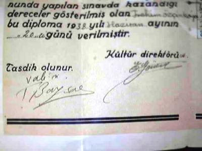 1937-1938 ders yılı sononda yapılan sınavda kazandığı dereceler gösterilmiş olan Fehim ÖZÇİNKO'ya bu diploma 1938 yılı haziran ayının 20. günü verilmiştir.