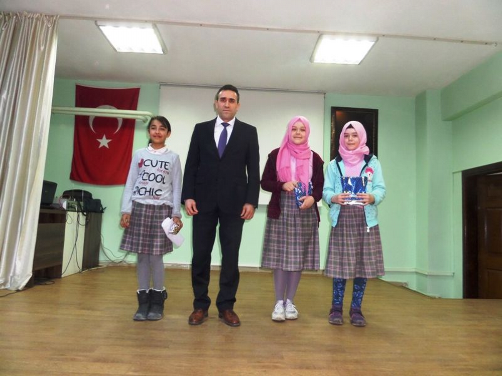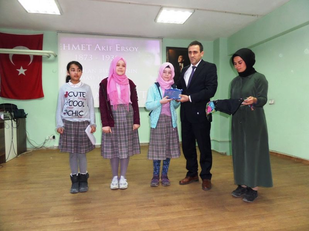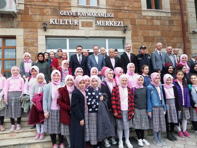 Geyve kaymakamı İlyas Memiş, okulda düzenlenen "Asım'ın neslinden, Mehmet Akif'e mektup" konulu yarışmada dereceye giren Afranur Akyol, Betül Rana Özsöz ve Ebrargül Yalçın'a ödüllerini verirken tebrik edip başarılar diledi.