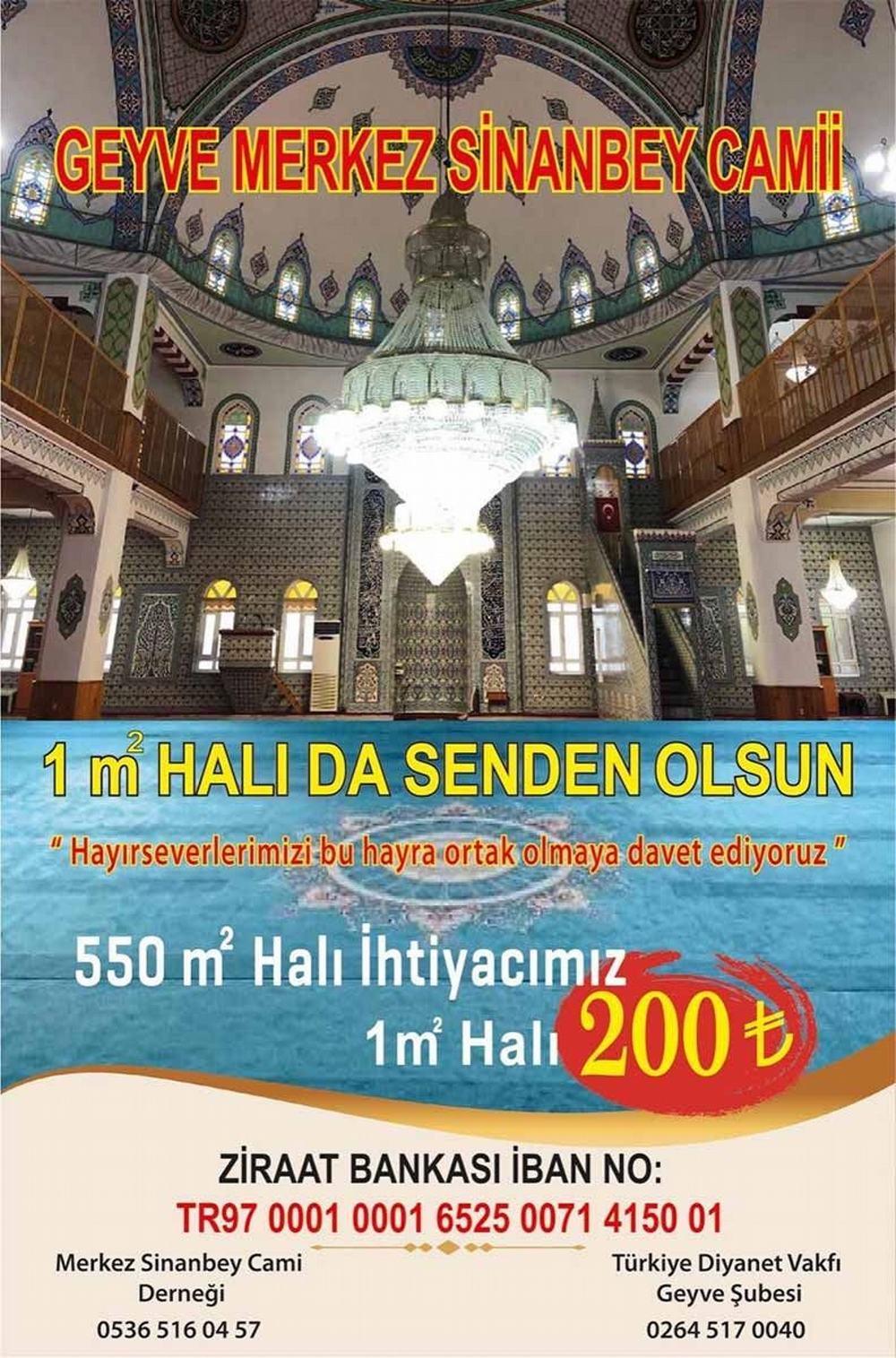 Geyve Sinan Bey Camisi Yaptırma ve Yaşatma Derneği başkanı Şaban Çakır: "Hayırsever vatandaşlarımızın desteğiyle camimizin tadilatını bitirdik, herkese teşekkür ederim." dedi.