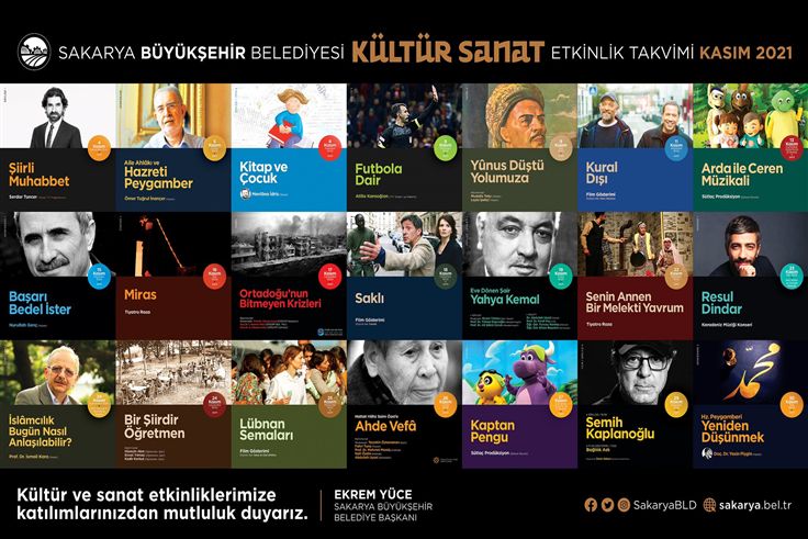Sakarya Büyükşehir Belediyesi Kasım Kültür Sanat Etkinlikleri başlıyor. Söyleşi ve imza günlerinden konferanslara, sinema gösterimlerinden tiyatro gösterimlerine, panellerden konser ve dinletiler ile saygı gecelerine kadar birçok farklı etkinliğin kültür sanat dostlarıyla buluşacağı takvimin ilk konuğu ise Yazar ve TV Programcısı Serdar Tuncer olacak. Ömer Tuğrul İnançer, Prof. Dr. İsmail Kara, Mevlana İdris, Mustafa Tatçı, Leyla İpekçi, Nurullah Genç, Prof. Dr. Ahmet Uysal, Semih Kaplanoğlu gibi kültür sanat dünyasının yakından tanıdığı isimlerin yanı sıra Karadeniz müziğinin sevilen ismi Resul Dindar konseri de Kasım Kültür Sanat Etkinlikleri arasında yer alacak.