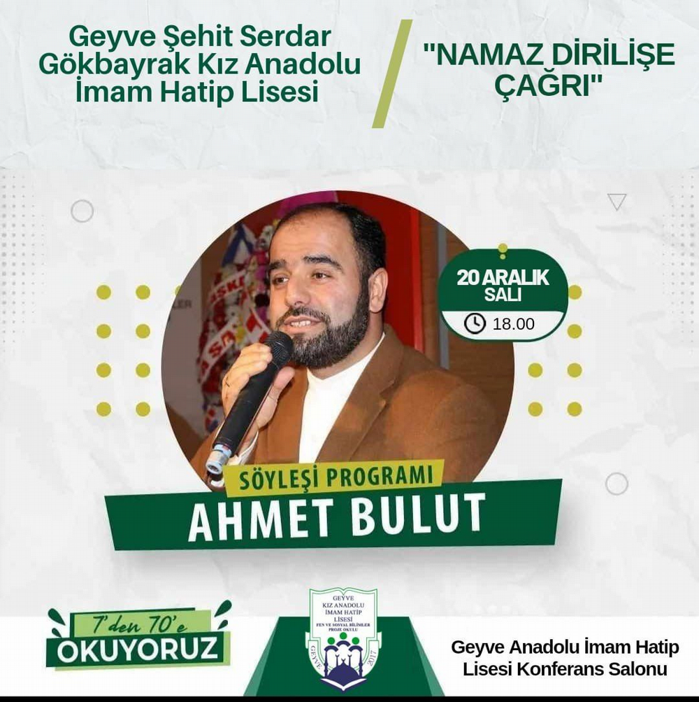 20 Aralık 2022 Salı günü Geyve Şehit Serdar Gökbayrak Kız Anadolu İmam Hatip Lisesinin davetlisi olarak Geyve’ye gelecek olan Ahmet Bulut Hoca, Geyve Anadolu İmam Hatip Lisesi Konferans Salonu’nda saat 18.00’de “Namazla Diriliş” konferansı yapacak ve program sonrasında kitaplarını imzalayacaktır.