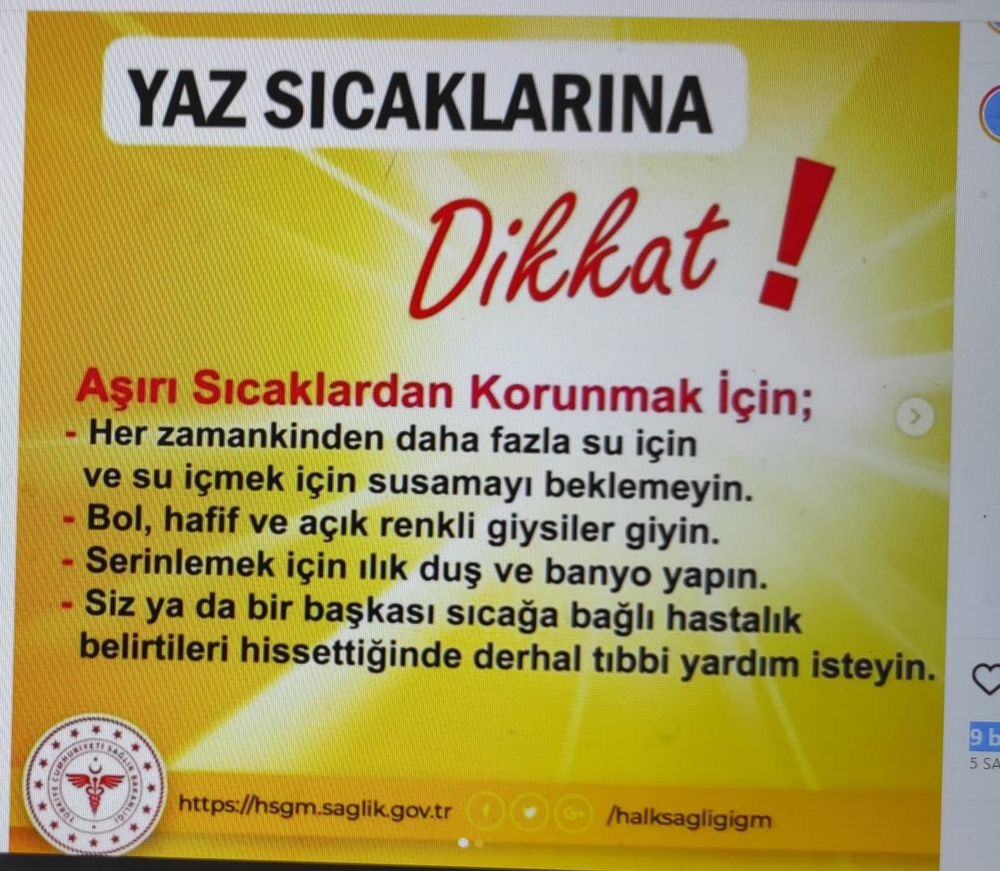 Sizlerin güvenliği ve sağlığı bizim için önemlidir. Aşırı sıcaklara karşı bilinçli ve tedbirli olalım ve aşırı sıcakların oluşturacağı olumsuz etkilerden alacağımız tedbirlerle korunalım.