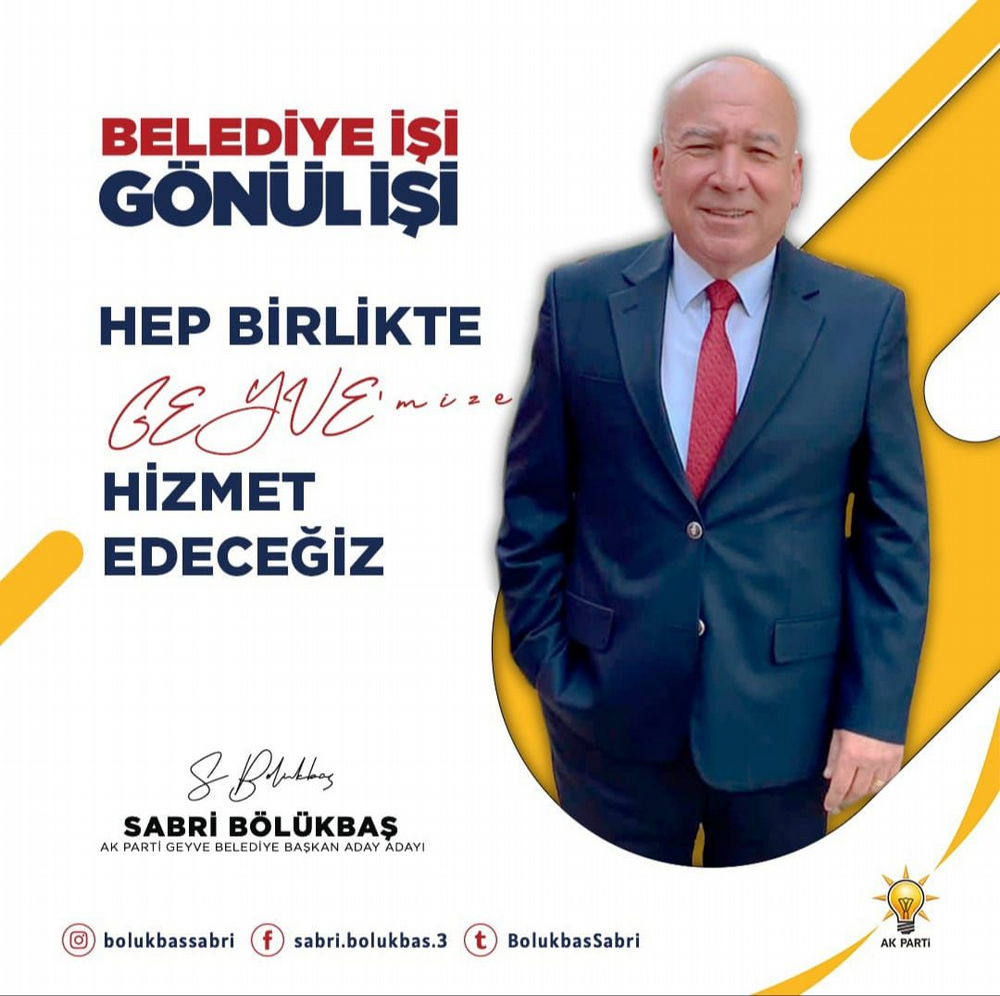 On yıllık belediye tecrübesi olan Sabri Bölükbaş konuyla ilgili şunları söyledi: Ben Geyve sevdalısım. Belediyecilik gönül işidir. Bunun için 31 Mart 2024'te yapılacak olan Mahalli İdareler Genel Seçimlerinde Geyve Belediye Başkanlığına adayım.