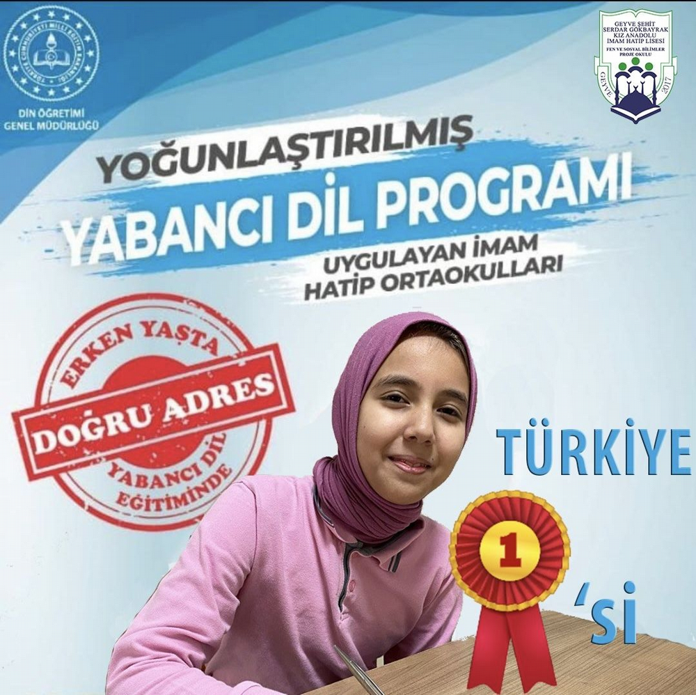 TÜRKİYE GENELİNDE GERÇEKLEŞTİRİLEN YOĞUNLAŞTIRILMIŞ YABANCI DİL PROGRAMI UYGULAYAN İMAM HATİP ORTAOKULLARI DENEME SINAVINDA, GEYVE KIZ AİHL 5. SINIF ÖĞRENCİSİ AYŞE MERYEM DİLİPAK BÜTÜN SORULARA DOĞRU CEVAP VEREREK BİRİNCİ OLDU.