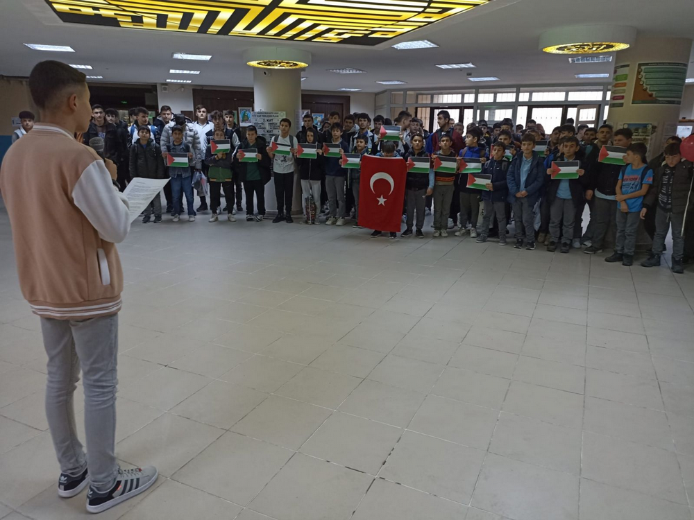 Geyve Anadolu İmam Hatip Lisesi öğrencileri, Filistin'e destek olabilmek için, FİLİSTİN BASIN AÇIKLAMASI yaptılar. Öğrenci Efe Çelik açıklamayı okudu.