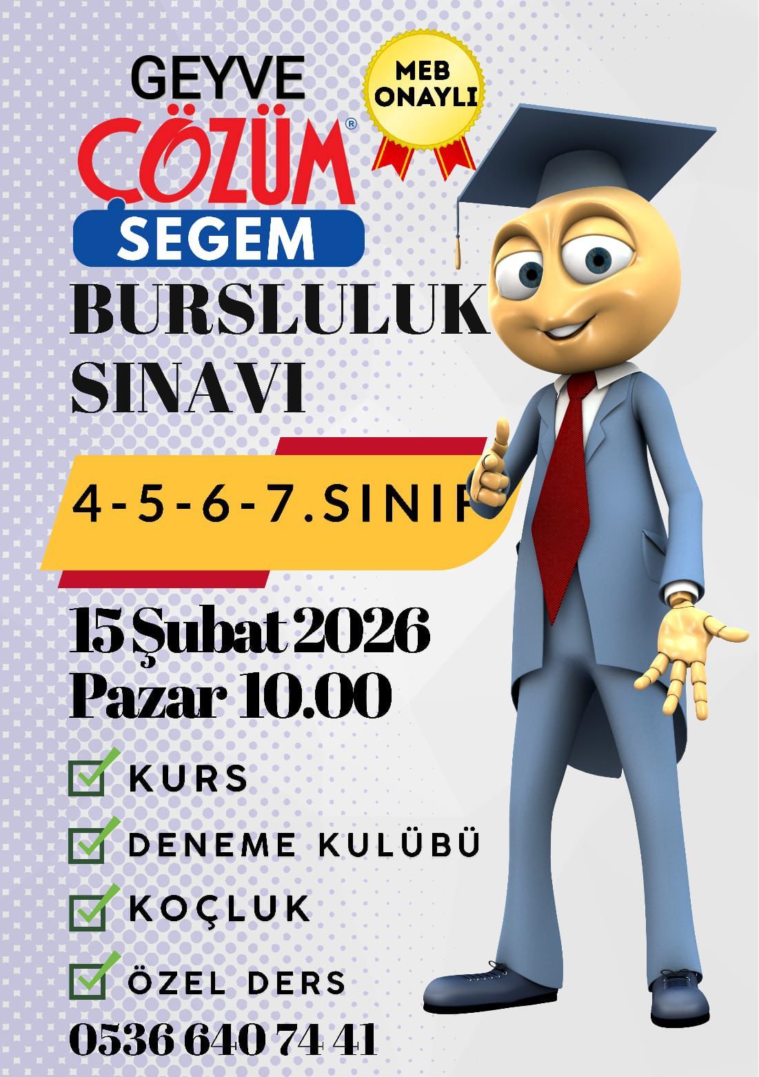 Eğitimdeki kalitesi ve başarı odaklı yaklaşımıyla tanınan Geyve Çözüm Kurs Merkezi, bu sınavla yetenekli ve motive öğrencileri keşfetmeyi ve onların gelişimine katkıda bulunmayı hedefliyor. Bursluluk sınavı, öğrencilerin akademik potansiyellerini ortaya çıkarmaları ve eğitim hayatlarında bir dönüm noktası oluşturmaları için büyük bir fırsat.