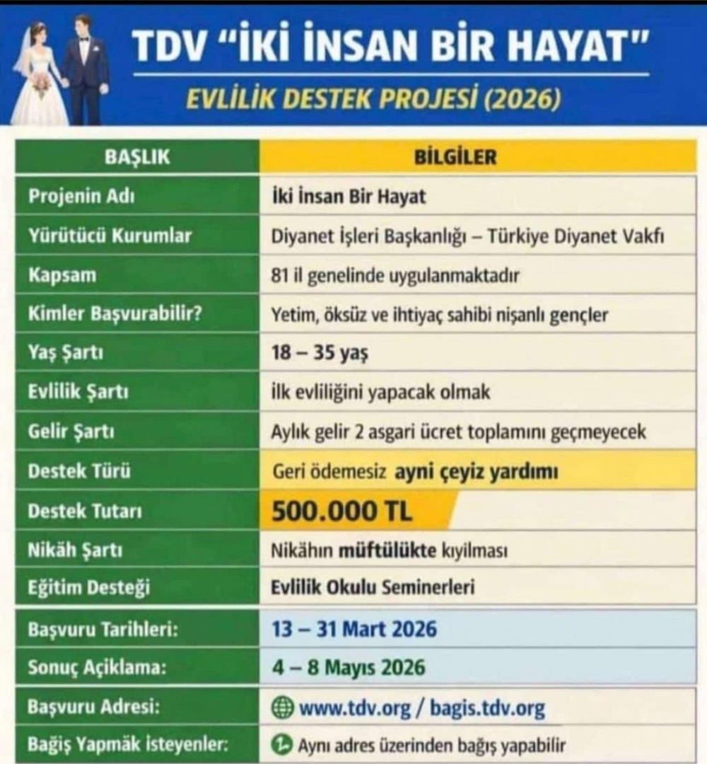 Türkiye Diyanet Vakfı, evlenecek olan gençlere 500 bin lira yardım yapacaktır Başvurular 13 Mart 2026'da başlamıştır, 31 Mart 2026 Salı günü sona erecektir.