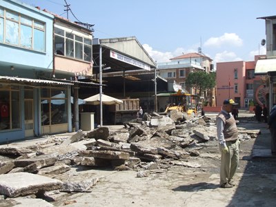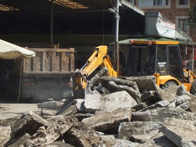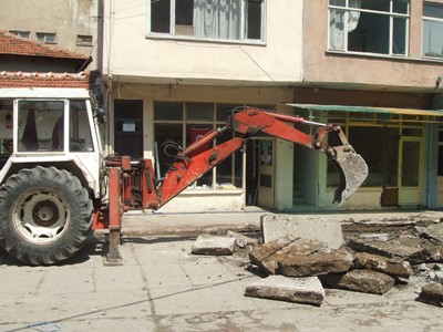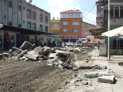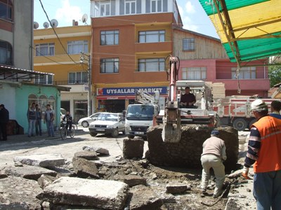 Zeminin kötü olması nedeniyle, kaldırılıp yerine parke yapılması için ekipler çalışmalarını hızlandırdılar. Beton zemin kırılıp kaldırılıyor ve taşınıyor.