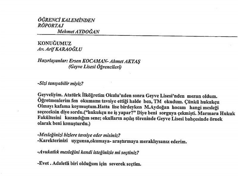 Öğrenci kaleminden Av. Arif Karaoğlu ile röportaj Konuğumuz: Av. Arif Karaoğlu Mustafa Hamdullah ERGİN 1.07.2010 - 17:07:00 Hazırlayanlar: Ersin Kocaman/Ahmet AktaşGeyve Lisesi öğrencileri Ersen Kocaman, Av. Arif Karaoğlu ve Ahmet Aktaş. #