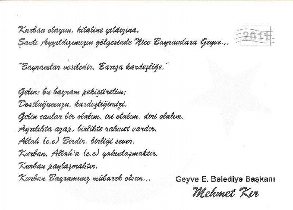 Kır'dan Bayram tebriki Mehmet Kır Kurban Bayramı tebriki yaptı. Editör 3.11.2011 - 12:42:00 Kır; Geyvelilerin Kurban Bayramını kutladı. #